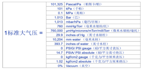 1 Pa= 1.02×10-5Kgf/cm2= 1×10-5bar = 0.01mbar= 9.87×10-6atm= 7.5×10-3torr= 4.01×10-3inH20= 7.5×10-3mmHg= 1.45×10-4PSI